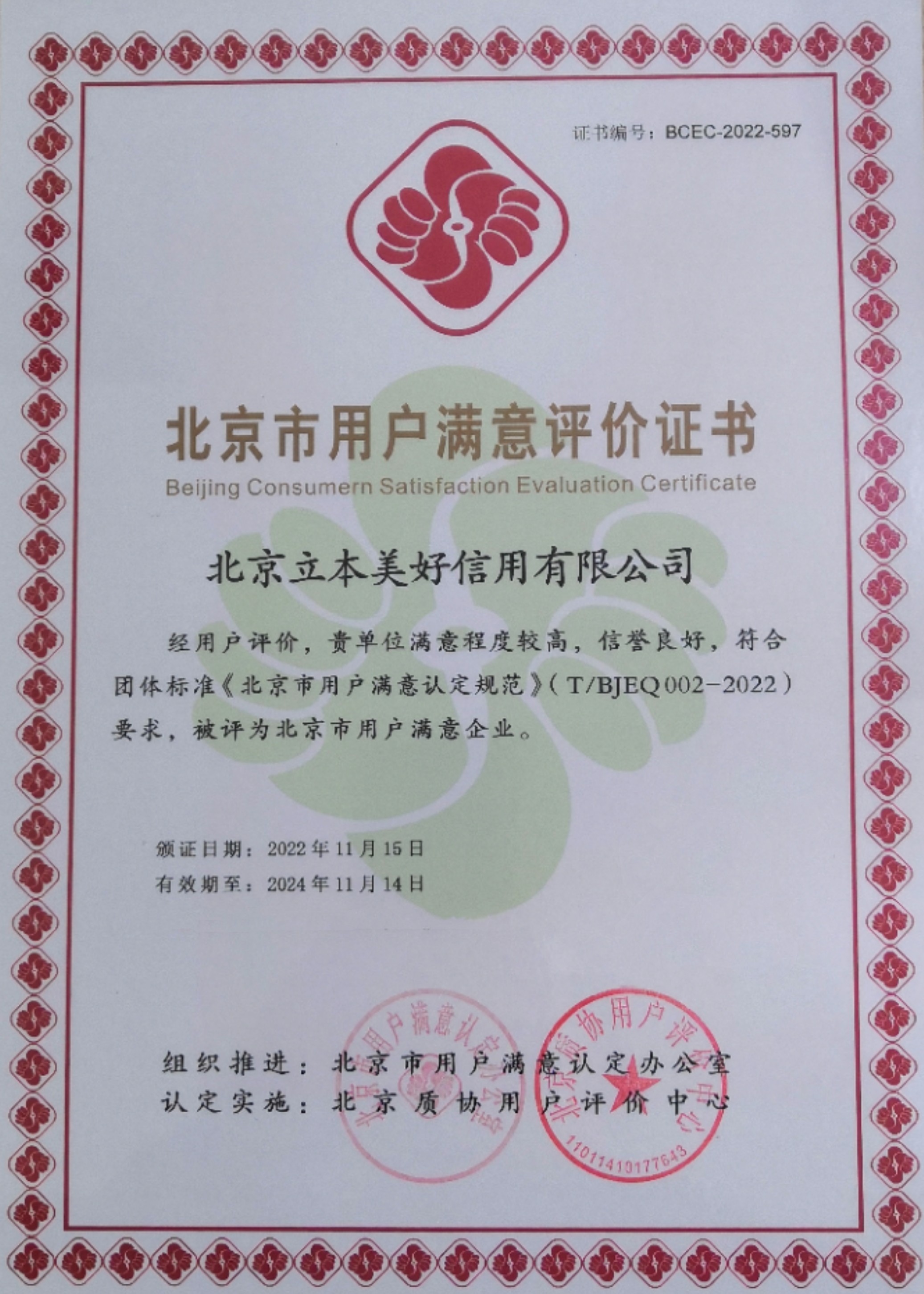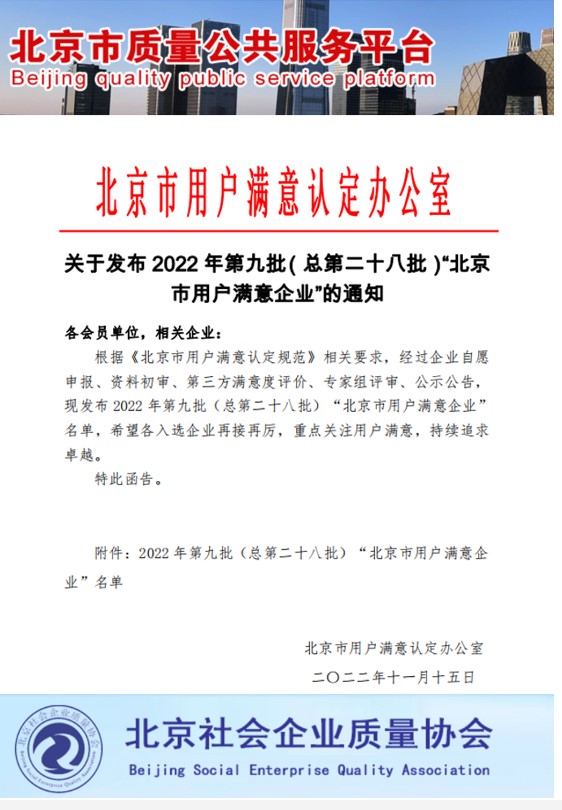 該評(píng)定活動(dòng)由北京市用戶滿意認(rèn)定辦公室組織推進(jìn),北京質(zhì)協(xié)用戶評(píng)價(jià)中心認(rèn)定實(shí)施,以《中共中央國務(wù)院關(guān)于開展質(zhì)量提升行動(dòng)的指導(dǎo)意見》為準(zhǔn)則,以《北京市用戶滿意認(rèn)定規(guī)范》相關(guān)要求為基準(zhǔn),經(jīng)過資料審核、第三方滿意度評(píng)價(jià)、專家組評(píng)審等多輪篩選流程,從參評(píng)的300家企業(yè)中,最終評(píng)定45家為“北京市用戶滿意企業(yè)”,通過率僅為15%。北京立本美好信用有限公司獲此榮譽(yù),意味著公司在客戶服務(wù)能力方面達(dá)到了較高水準(zhǔn),獲得了較高的用戶滿意度。