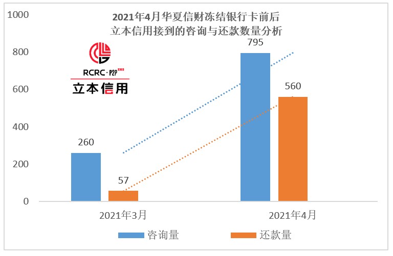 作為我國首家且唯一一家P2P善后服務(wù)提供商,北京立本美好信用有限公司一直關(guān)注和參與到P2P的善后工作中,主要為借款人提供協(xié)商減免、征信修復(fù)、解除凍結(jié)等服務(wù)。2021年4月,華夏信財大面積凍結(jié)借款人銀行卡,大批的借款人來電來信向立本信用咨詢?nèi)绾芜€款、如何修復(fù)征信以及如何解除凍結(jié)。為此,立本信用整理了華夏信財凍結(jié)前后的向立本信用咨詢和還款情況對華夏信財法催效果予以分析如下: