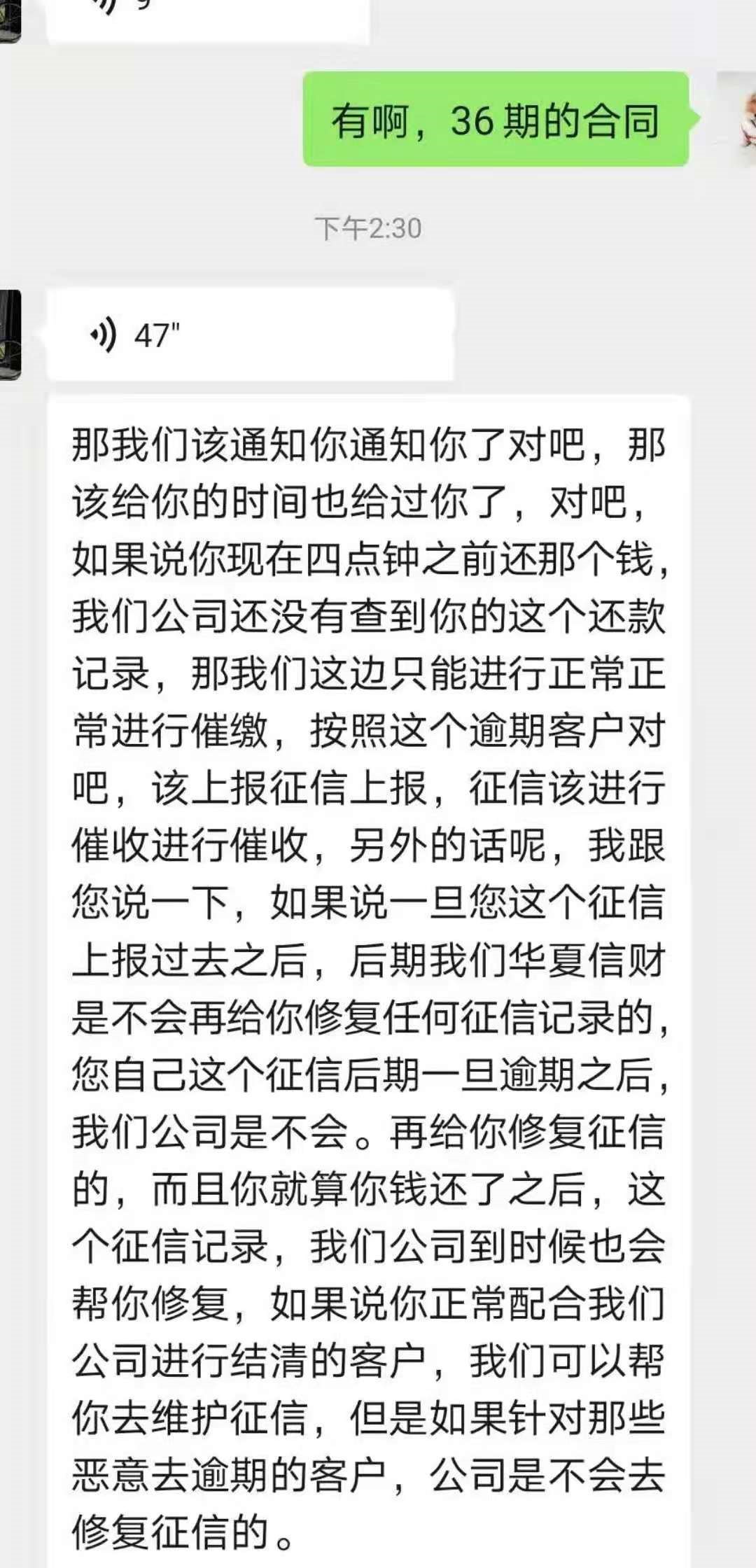 華夏信財(cái)要求我一次性結(jié)清,在我沒有逾期的情況下,我要求看合同,他說沒有合同,合同被警方哪有了,恐嚇孕婦。如果不結(jié)清按逾期處理,統(tǒng)一將不良記錄上報(bào)人行征信數(shù)據(jù)還要凍結(jié)我名下賬戶進(jìn)行劃扣,向相關(guān)授權(quán)人員核實(shí)您的借款實(shí)際用途、投資收益、名下資產(chǎn)、家庭收入、開支、還款態(tài)度等問題,我沒有逾期,現(xiàn)在好像我怎么樣了是的,我一個(gè)孕婦,讓他們嚇的已經(jīng)先兆流產(chǎn)了,希望立本信用能幫我處理。