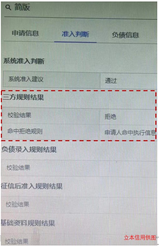 最近銀行信貸領(lǐng)域瘋狂在傳的兩張截圖,一張是貸款申請人因為“命中執(zhí)行”被拒絕貸款的截圖,一張是銀行大數(shù)據(jù)風控系統(tǒng)司法風險篩查的截圖。這進一步證明了,我國司法大數(shù)據(jù)全面接入了金融系統(tǒng)、應(yīng)用于信貸風控,包括裁判文書、被執(zhí)行人、失信被執(zhí)行、限高、終本案件,以及司法訴訟過程流程中的開庭公告、立案信息等。